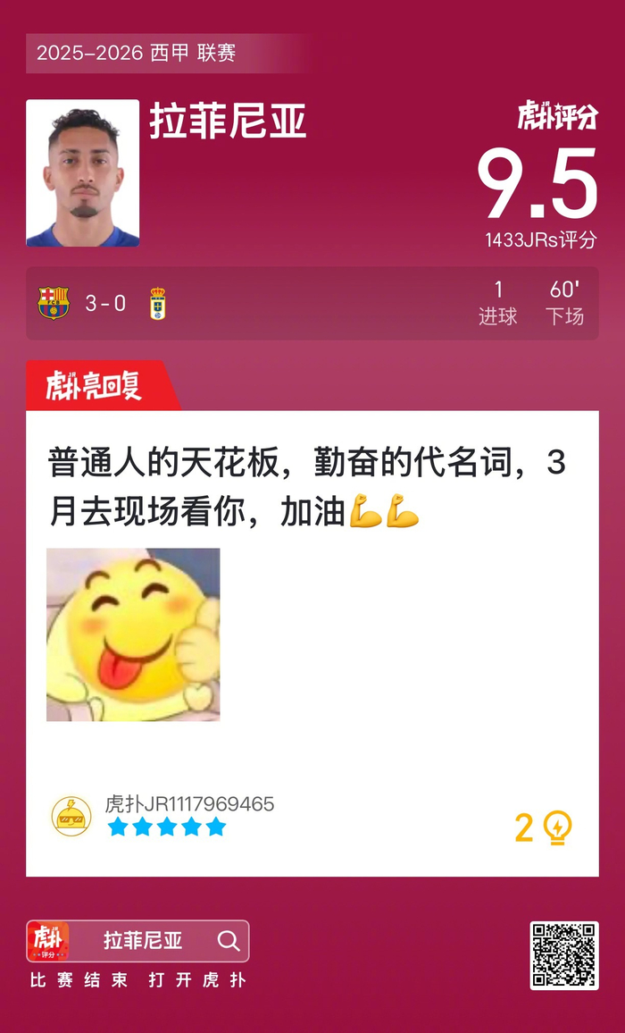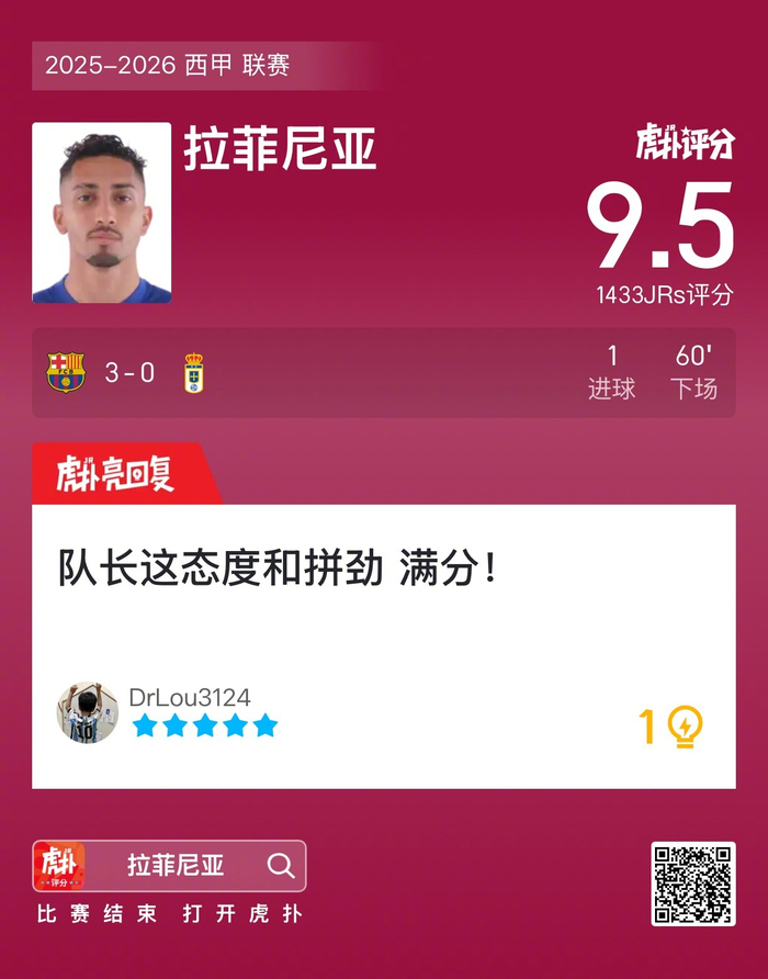 #巴萨3比0皇家奥维耶多# 拉菲尼亚打进一球,赛后收获9.5的虎扑评分!