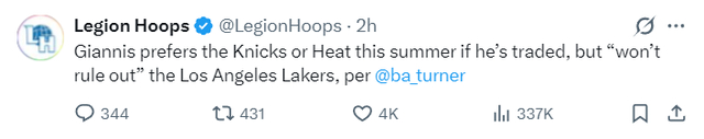 根据NBA记者的说法,扬尼斯今夏倾向于加盟尼克斯,但不排除选择洛杉矶湖人队。